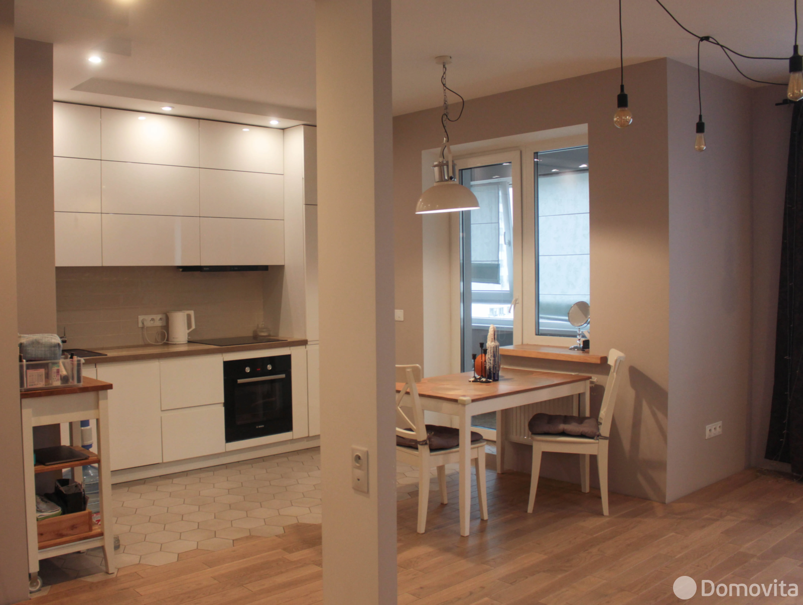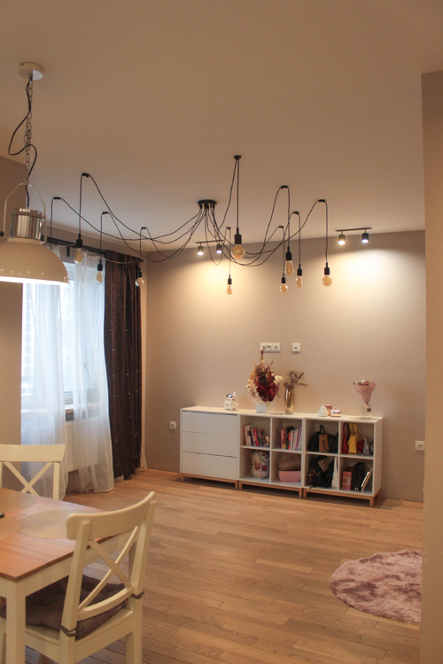 Кухня–гостиная: функционально и со вкусомПродуманное зонирование создаёт гармоничное пространство: кухня и гостиная разделены аккуратной столовой группой.