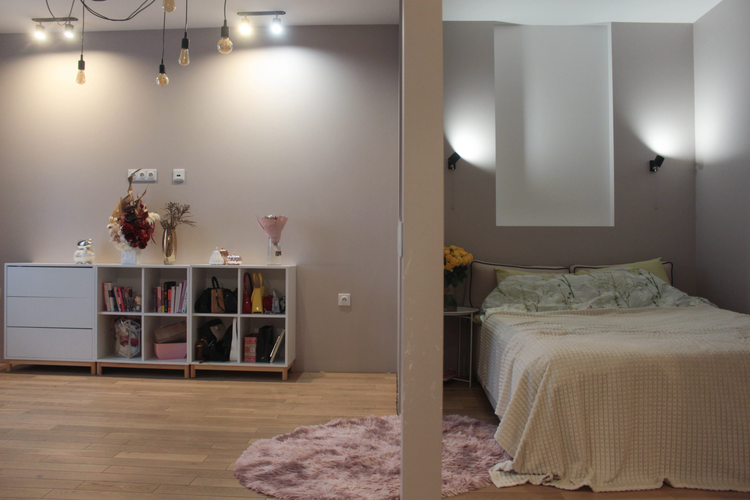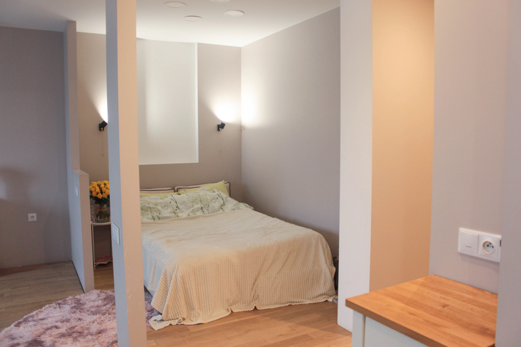 СпальняСпальное место аккуратно отделено от общего пространства, создавая уединенную зону для отдыха.