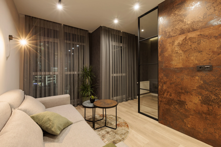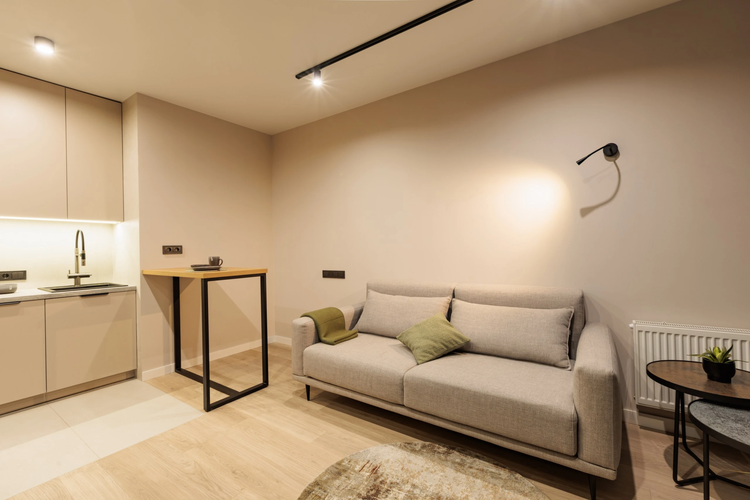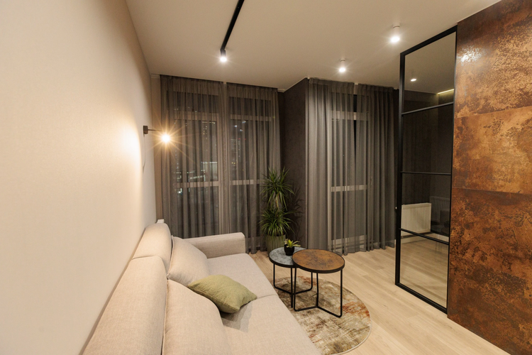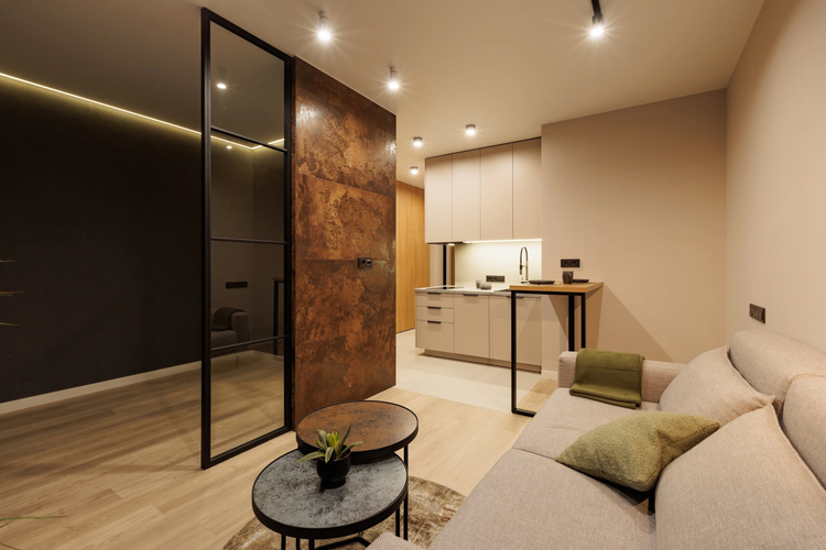 Квартира с удачным зонированием: кухня-гостиная для ежедневной жизни и отдельная комната под спальню или кабинет. Интерьер современный, с продуманным светом и акцентными решениями, выглядит свежо и "даже лучше чем на фото".