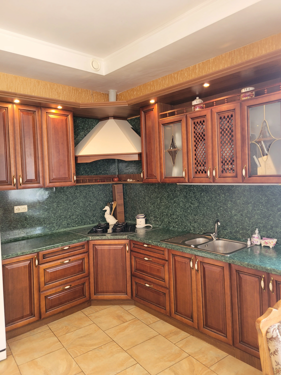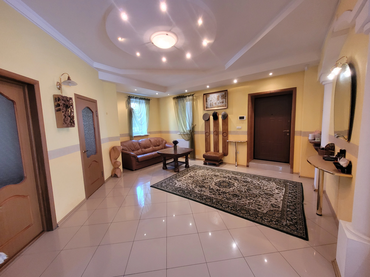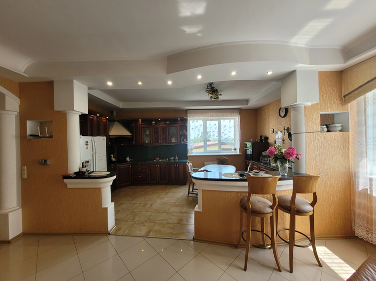 2-й уровень - просторная гостиная с кухней (расположен кухонный гарнитур, с посудомоечной машиной, вытяжкой, духовым шкафом), совместный санузел, камин (построен с использованием натурального мрамора), гардеробная, выход в цокольный этаж. В гостиной установлен кондиционер.