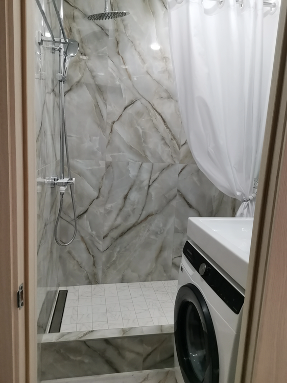 - Ванная комната с душевой кабиной, стиральной машиной и феном.