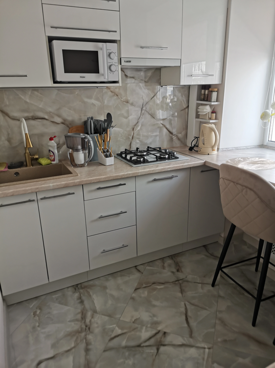 - Современная кухня с посудой и техникой (холодильник, плита, микроволновая печь, электрический чайник).