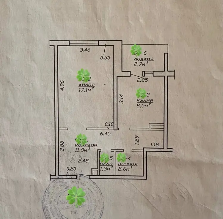 Общая площадь квартиры 41.4 кв.м. (по СНБ – 44.1 кв м., жилая – 17.1 кв. м, площадь кухни – 8.5 кв.м.