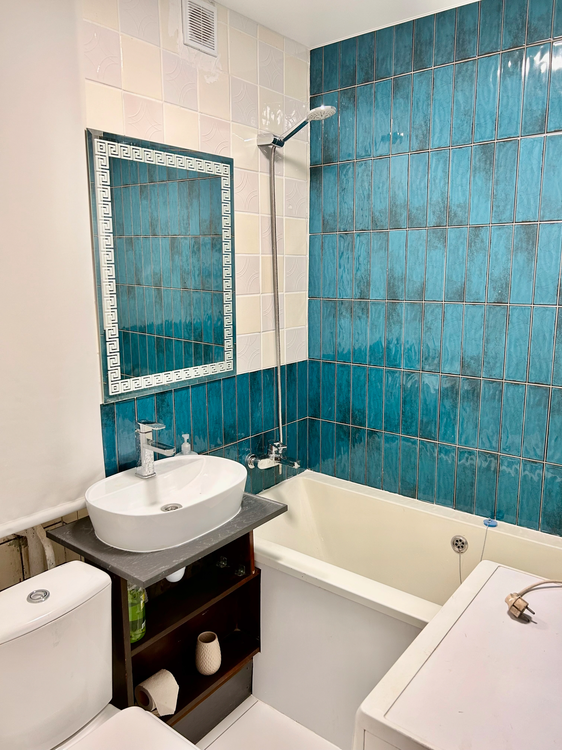 Полы все ламинат , сан узел - весь плитка . Вся сантехника унитаз новый керамин , раковина новая , ванна акриловая , смесители новые .