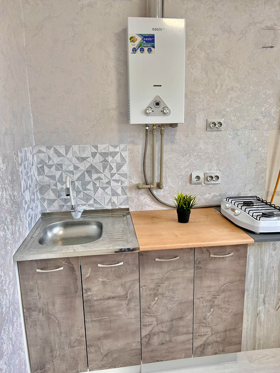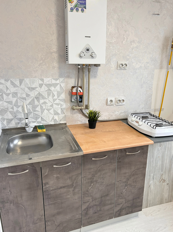 Все стены выровнены штукатуркой, проведена большая работа , установлена новая газовая колонка , счетчик газа. Все счетчики газ , вода , свет новые.