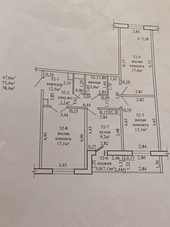 Общей площадью 73.4 м2., жилая 47.6 кв.м., кухня 9.2 кв.м. Квартира расположена на 6 этаже 7-и этажного панельного дома.