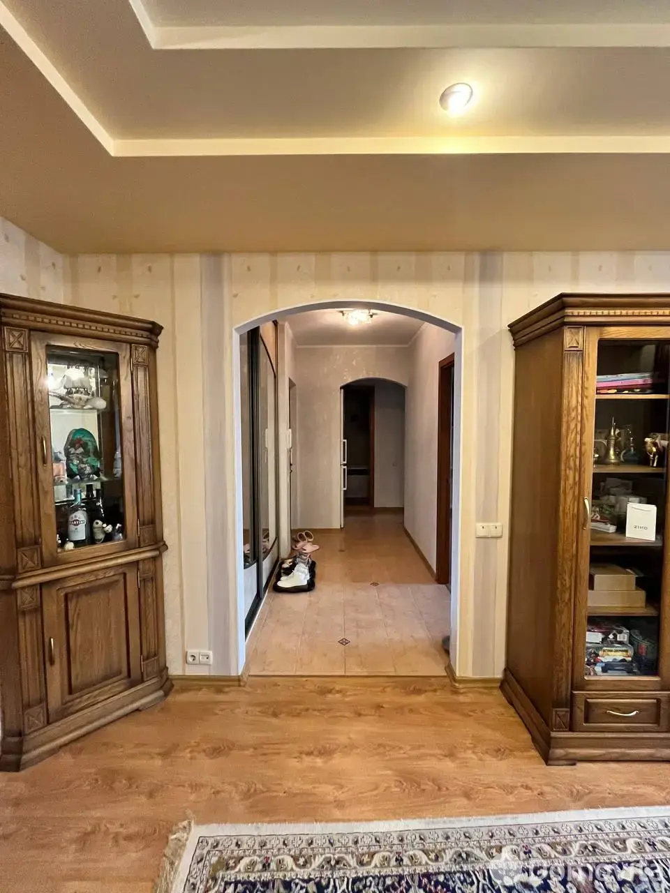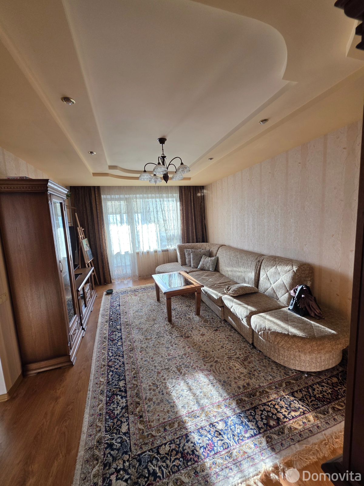 В зале расположен набор корпусной мебели из массива дерева, комфортный диван.