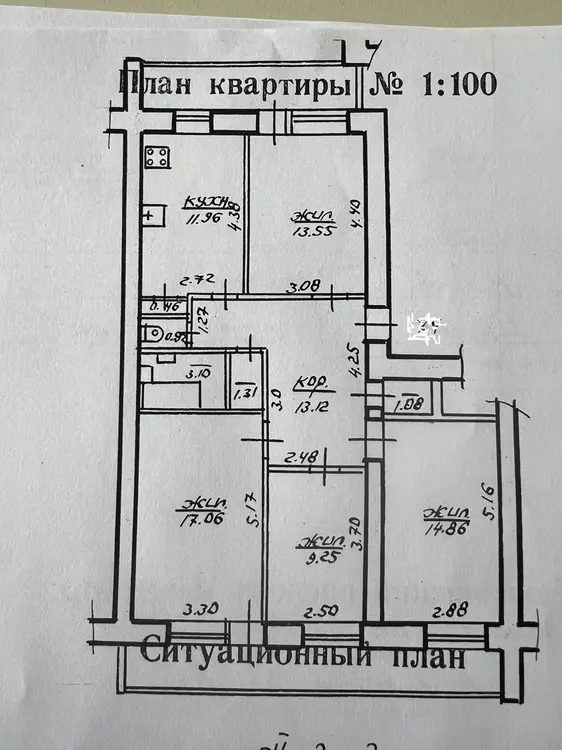 Общая площадь 87 кв.м., жилая 55 кв. м, кухня 12 кв.м.