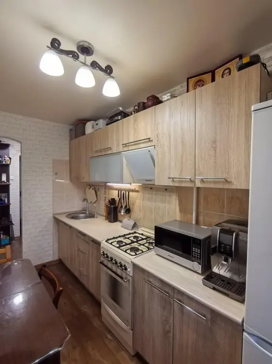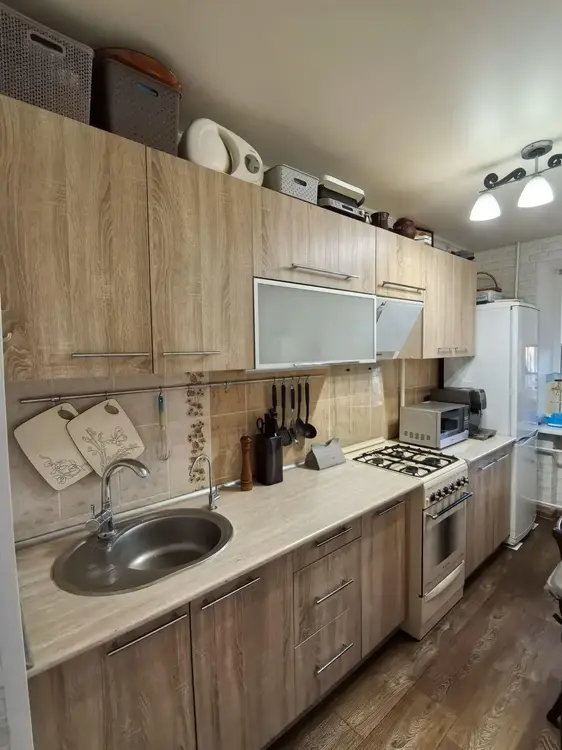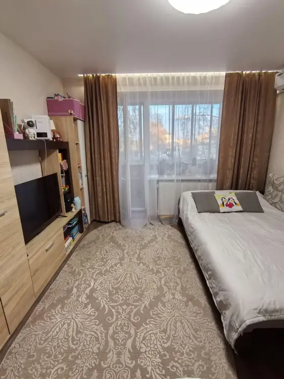 Установлена входная металлическая дверь. Установлена новая кухонная мебель. Вся встроенная техника представленная на фото остается при продаже. Просторная лоджия располагается вдоль комнаты и кухни застеклена .