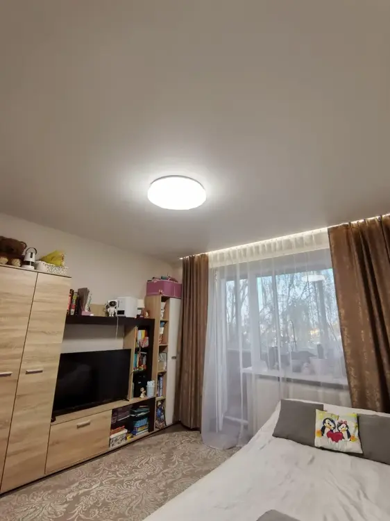 На полу линолеум в коридоре и кухне, комнате – ламинат, санузле - плитка, сантехника новая. Во всей квартире установлены стеклопакеты. В комнате установлен кондиционер. В квартире – натяжные потолки. В квартире заменена проводка, установлены автоматы, грамотно смонтировано зональное освещение, большое количество розеток.