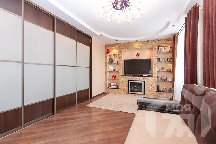 - Большой зал с двумя окнами — много естественного света. В гостиной оборудована декоративная ТВ-зона с нишами и камином. Во второй комнате — встроенная система хранения, удобно использовать как спальню или детскую.