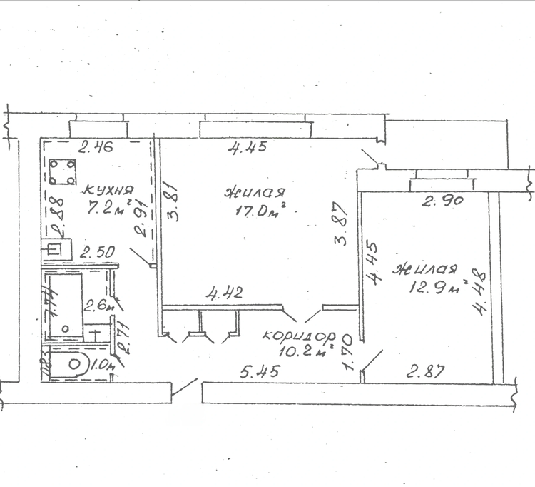 Общая площадь-50,7 кв.м.,по СНБ-52,1 кв.м., жилая площадь-29.9 кв.м., площадь кухни — 7,2 кв.м. Две большие полноценные комнаты 17 кв.м. и 12,9 кв.м. хорошей правильной формы, просторная прихожая, в которой разместится длинный шкаф-купе. Выход на лоджию из центральной комнаты, Окна выходят на южную сторону что обеспечивает отсутствие шума от насыщенного транспортного движения на центральной улице города.