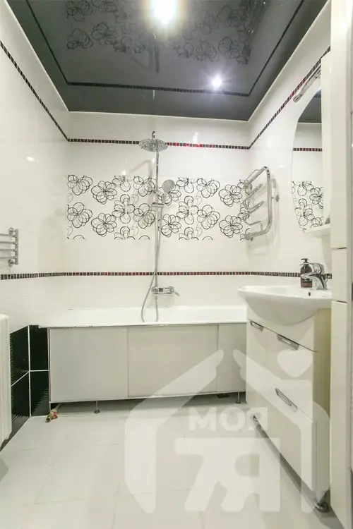 -Санузел раздельный. Ванная оформлена в контрастной чёрно-белой гамме: крупноформатная белая керамическая плитка. Потолок — чёрный глянцевый натяжной с точечными светильниками. Сантехника полностью укомплектована: встроенная ванна, душевая стойка с тропическим душем, умывальник на белой тумбе с ящиками.