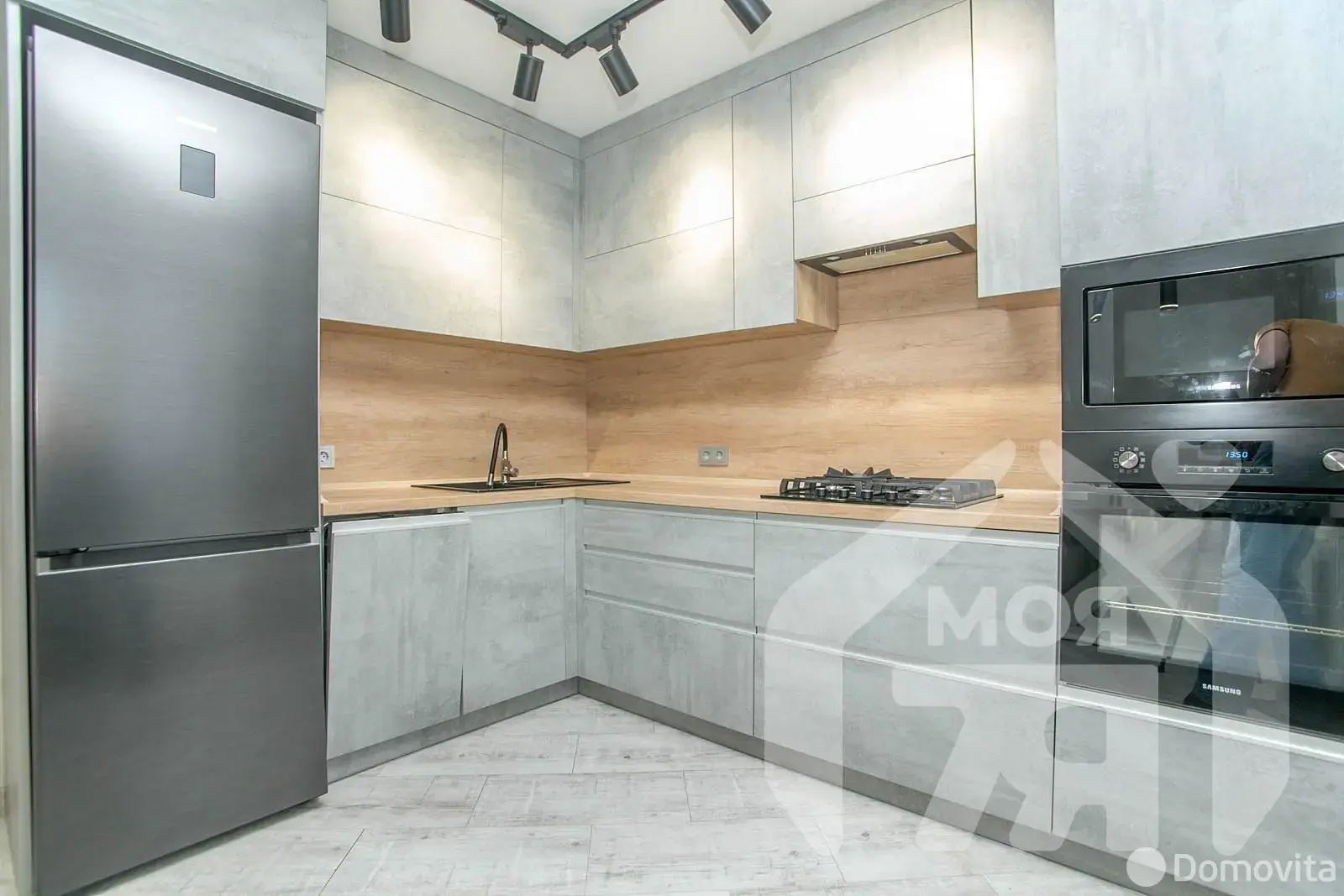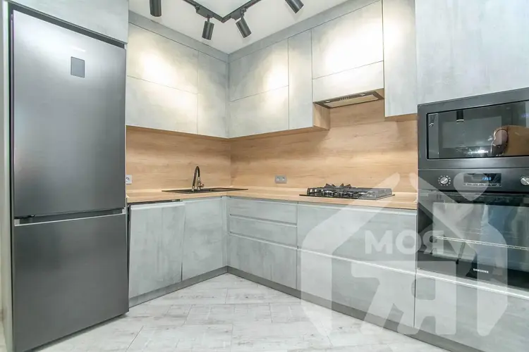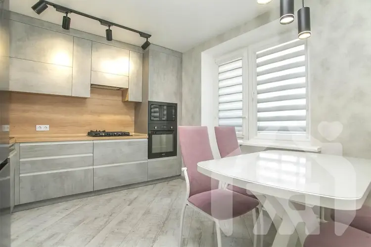 -Кухня площадью 10,6 м² позволяет полноценно обустроить как рабочую зону, так и обеденную. Гарнитур выполнен в лофт-скандинавском стиле: фасады под бетон без ручек, столешница и фартук в декоре светлого дуба. Вся техника встроена и остаётся: варочная панель, духовой шкаф, микроволновка, посудомоечная машина и холодильник. Освещение двухуровневое — чёрный трековый светильник с поворотными спотами над рабочей зоной и подвесные цилиндрические светильники над столом: каждая зона работает самостоятельно.