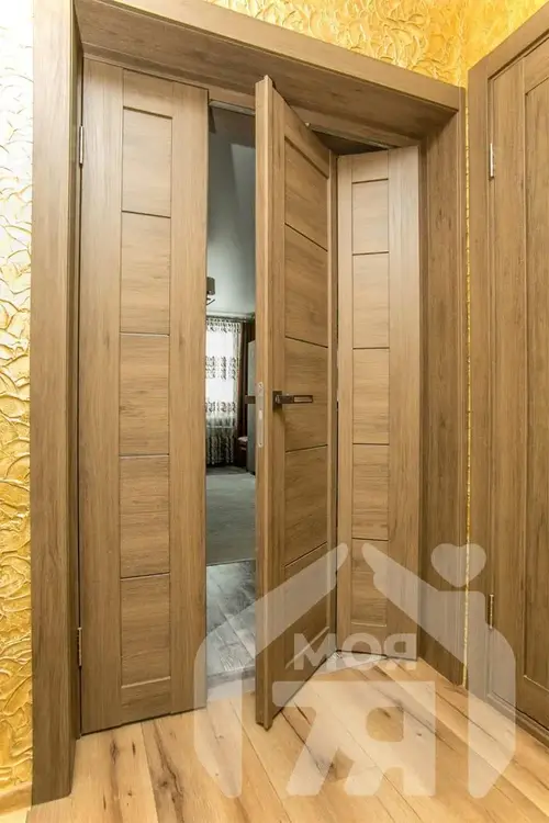 -В коридоре предусмотрена удобная кладовка, межкомнатные двери новые, МДФ, выдержаны в одном стиле с мебелью. В гостиной - дверь по уникальному проекту с оригинальной системой створок, которая становится интерьерным акцентом.