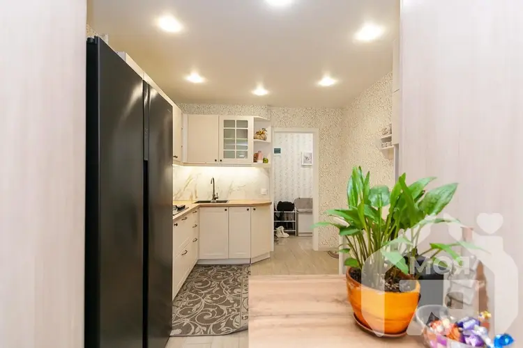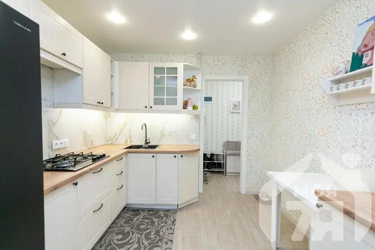 - Кухня оборудована встроенным кухонным гарнитуром, который остается новому владельцу. Это позволяет сразу пользоваться помещением без дополнительных затрат на обустройство.