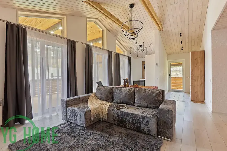 Отличная планировка - уютная кухня-гостиная с выходом на большую террасу, 2 спальни, санузел с сауной, топочная (кладовая)