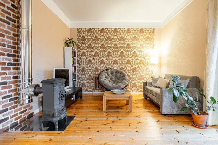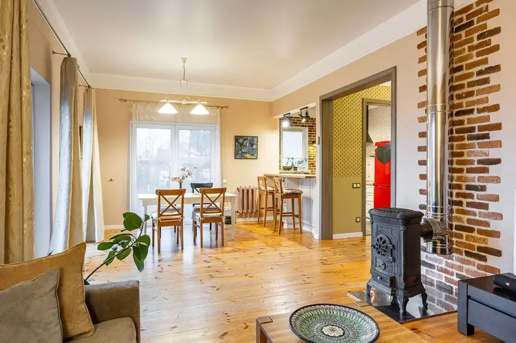 Гостиная полуобъеденена с зоной кухни, есть барная стойка. Для уюта установлен небольшой камин.