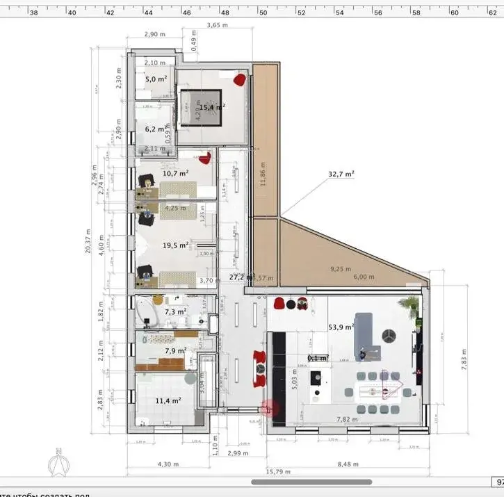 Отличная планировка дома (164.3 кв.м.):3 спальни (55.9 кв. м.), большая кухня – гостиная (54,2 кв. м.), гардеробная (7.2 кв. м.), 2 раздельных сан. узла, котельная. Потолки высотой 3.62 метра. Рядом баня площадью 44 кв. м..