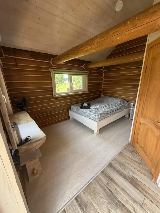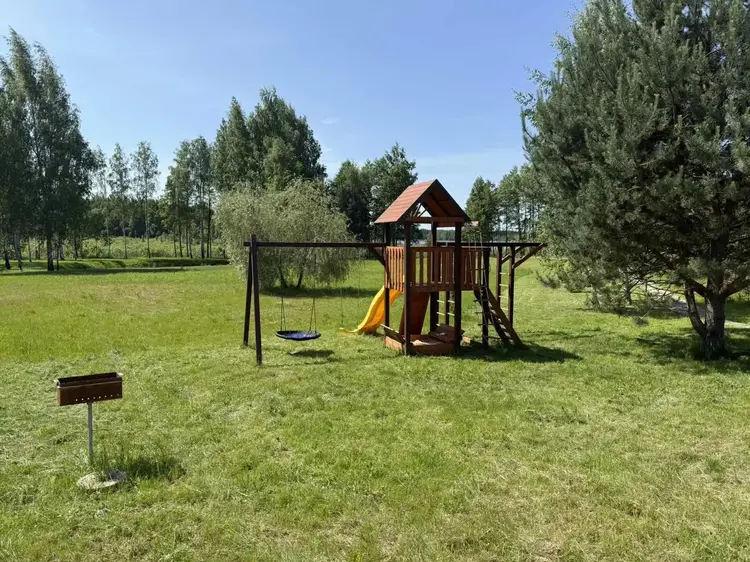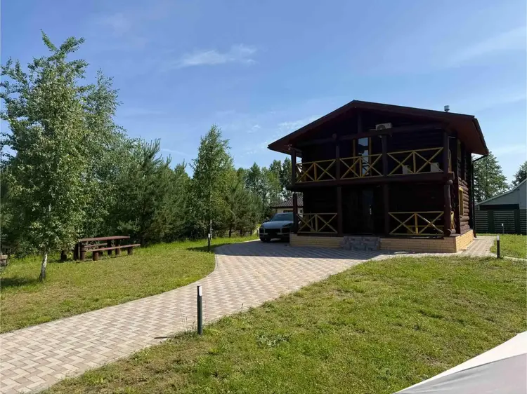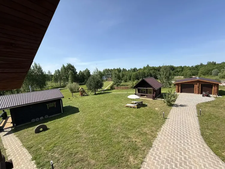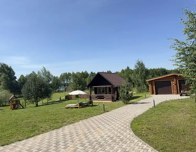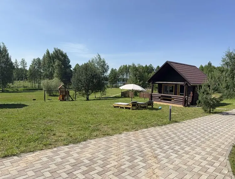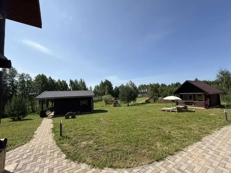 На территории имеются 3 готовых домика для проживания, гараж, детская площадка, зона барбекю, зона отдыха, личный пруд, сруб для бани с дизайнерским проектом, выложены тротуарные дорожки, уличное освещение, система видеонаблюдения, пирс и дорожка к пирсу из ольхи.