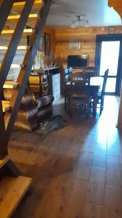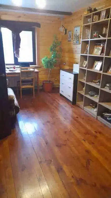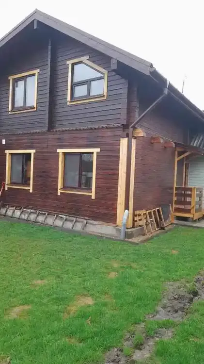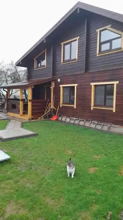Коттедж деревянный, теплый – из профилированного бруса. Снаружи дерево обработано тонирующим антисептиком с защитой от ультрафиолета. Очень хорошая звукоизоляция. Централизованные вода, газ, электричество.