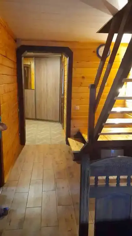 Второй этаж: три жилые комнаты, кладовая, санузел (электрический бойлер на 50 л, акриловая ванна, раковина, унитаз) + инфракрасная сауна (двухместная). Сауна отделана вагонкой из липы. На бойлер заведена горячая вода с котла, расходы на подогрев минимальные.