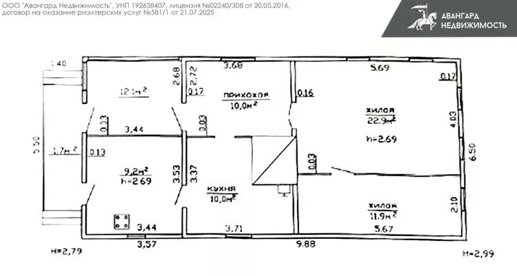 В доме две просторные комнаты 22.9м2 и 11.9м2, кухня площадью 10,0м2. В доме деревянные перекрытия, кровля – шифер, электроснабжение есть, канализация местная, на участке есть колодец. В доме печное отопление. Дом нуждается в ремонте.