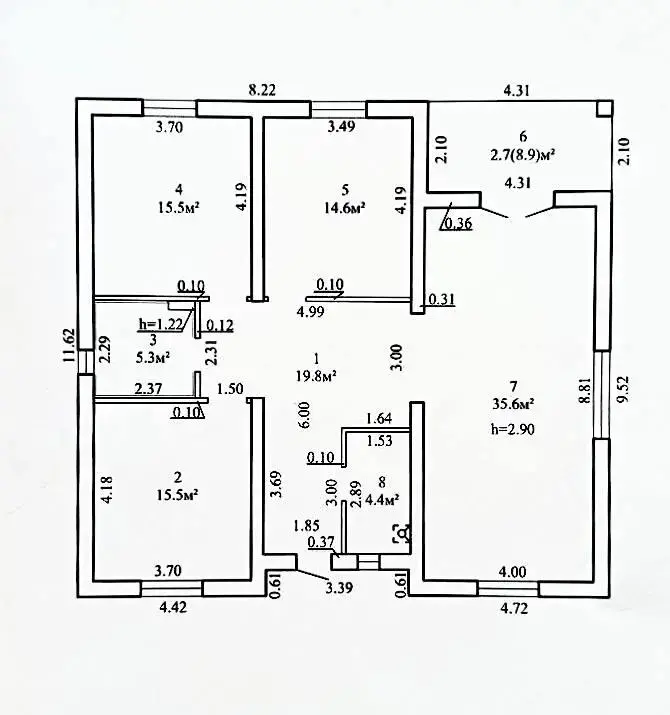 Площадь застройки 134 кв.м, общая 113,4 кв.м, жилая 81,2 кв.м, в том числе кухня-гостиная 35,6 кв.м. С/У 5,3 м.кв. дополнительный туалет установлен в топочной комнате.