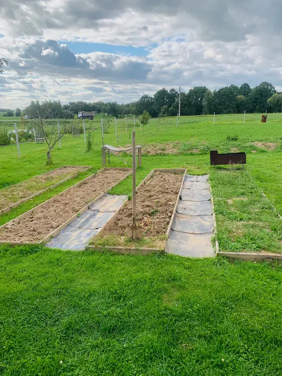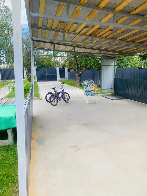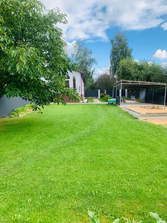 Большой ухоженный участок (12 соток). На участке имеется навес с бетонированной площадкой, фундамент под гараж. Плодовые деревья.