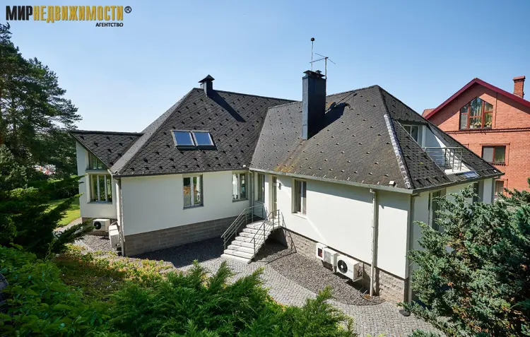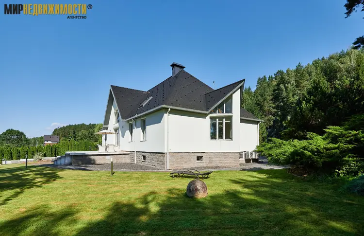 Конструкция дома: фундамент – бетон; стены – шлакобетон оштукатуренный, мансардный этаж – кирпич; перекрытия железобетонные; кровля – мягкая финская с защитой от снега, система «Теплоскат». Фасад утепленный, оштукатуренный. Реализована система активной молниезащиты. Окна алюминиевые, москитные сетки.