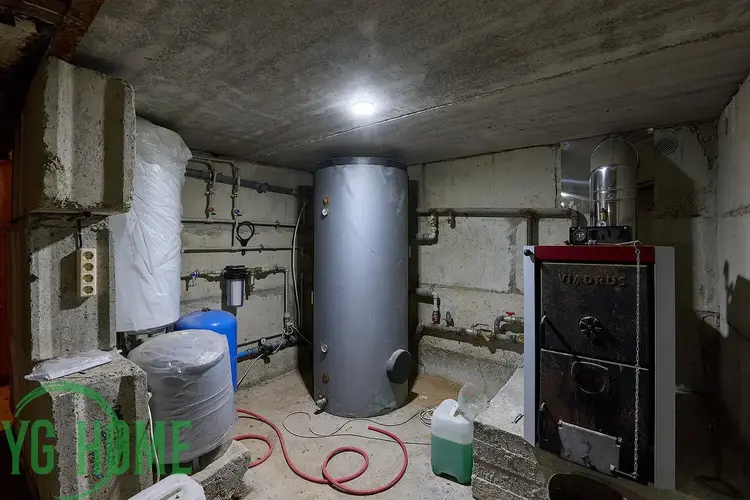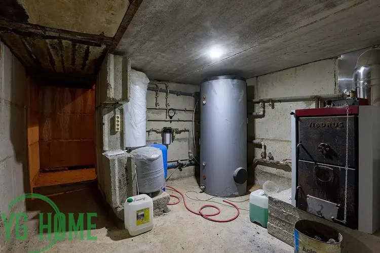 Цокольный этаж – котельная, установлен твердотопливный котел, насос, бойлер на 150 литров, фильтры тонкой и грубой очистки, тепловой аккумулятор на 500 литров.