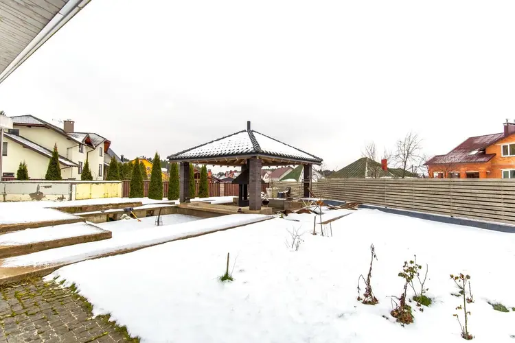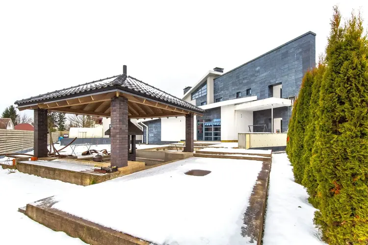 - В задней части дома расположены уютная беседка с зоной барбекю и фонтан, идеальные для отдыха с семьей или друзьями. Для любителей садоводства предусмотрена теплица.