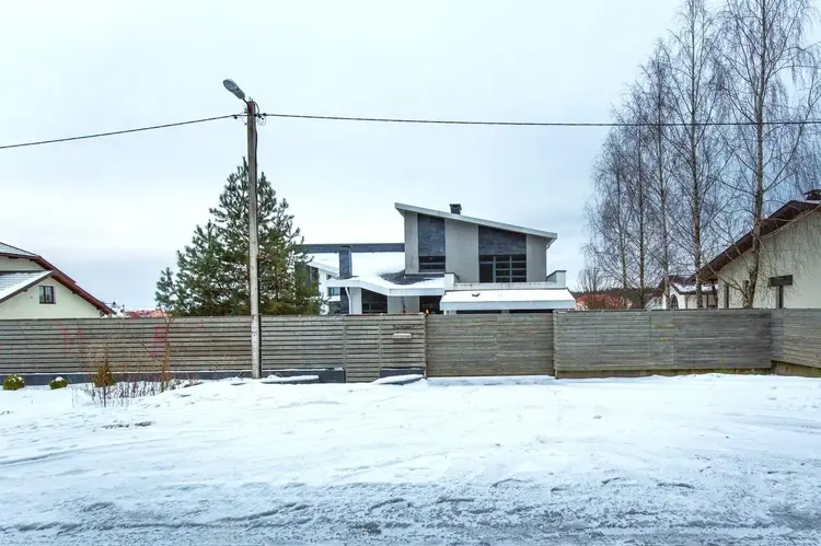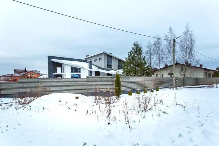- Стильный, надежный забор, откатные ворота, парковочные места для нескольких автомобилей.