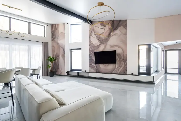 Просторная кухня-гостиная 70,7 м2 с панорамными окнами и выходом на террасу. Вид на поле и лесной массив. Очень красивые закаты.