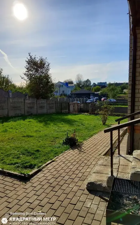 Участок солнечный, имеет правильную форму, немного под наклоном.По контуру огорожен.Выделена зона под огород, есть парник из поликарбоната.Газон. Плитка. Декоративные кусты, плодовые деревья.Просторная бесседка из дерева.
