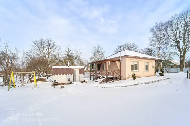 За домом расположена крытая терраса. Как приятно находиться там ранним утром, выпить чашечку ароматного кофе под пение просыпающихся птиц. Или отдохнуть вечером от шума и суеты, уютно утроившись в мягком кресле с любимой книгой в руках. А какие сочные шашлыки можно жарить прямо во дворе! Также есть своя баня, детские качели и батут. Каждый член семьи и ваш гость найдет себе развлечение и отдых по душе.