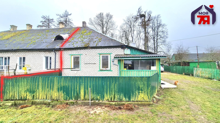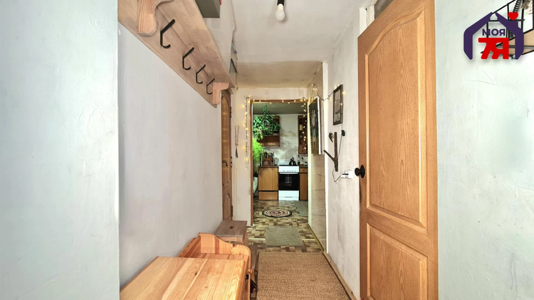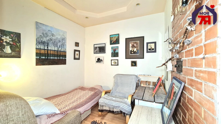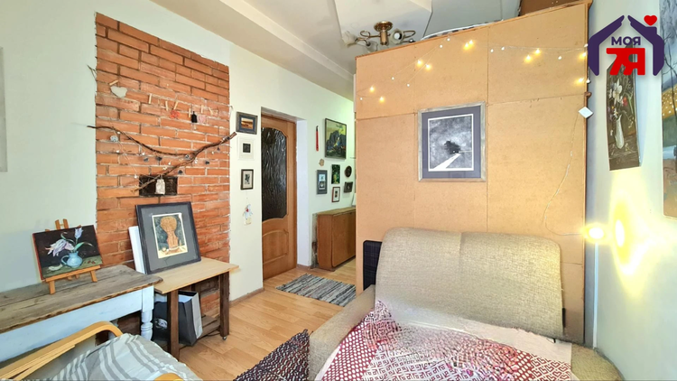 - Квартира находится в «панском» доме начала XX века. Площадь по СНБ составляет 56,5 кв.м, жилая площадь двух комнат равна 27,9 кв.м. Кухня площадью 9 кв.м оборудована большой печью, также предусмотрены кладовая и санузел. Высота потолков достигает 3 метров, за счёт чего пространство выглядит светлым и свободным, располагающим к спокойной работе и отдыху. Основа дома представляет собой бревенчатый сруб 1902 года, позже обложенный кирпичом и разделённый на квартиры с отдельными входами. Бревно крепкое и надёжное, без смоляных сборов.