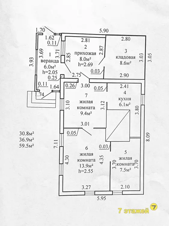 Дом общей площадью 73,3кв.м., из них общая площадь - 59.5кв.м., жилая площадь - 36.9, размер кухни - 6.1 кв.м. Отличный фундамент, крыша шифер (пережила не одну суровую зиму),