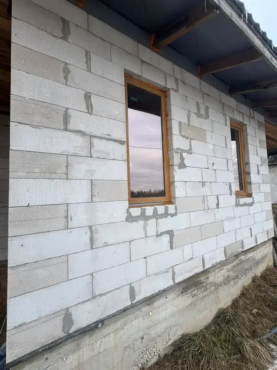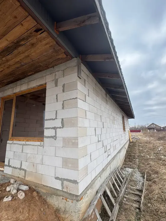 Стены – газосиликатный блок 400 мм. Перекрытие - железобетонная плита 300мм с утеплением. Стены оштукатурены с армированием.