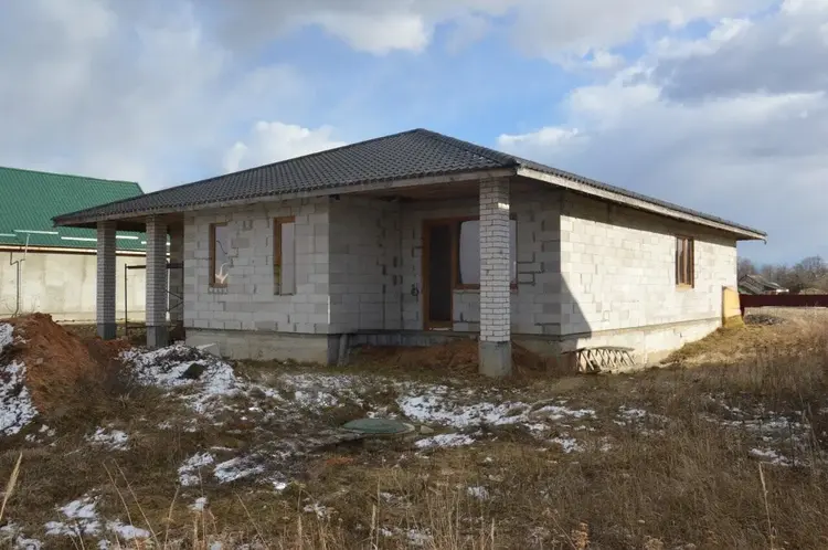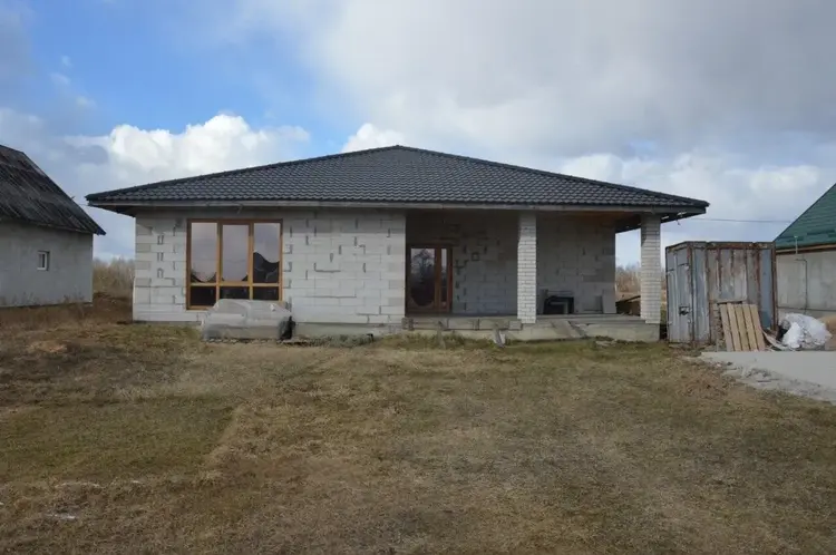 Фундамент - ленточный, стены газосиликат, залит армопояс - поверх смонтированы плиты, потолок утеплен ватой - 200мм, кровля - металлочерепица, алюма-цинк 0.5 толщина, гарантия 25 лет на металл.