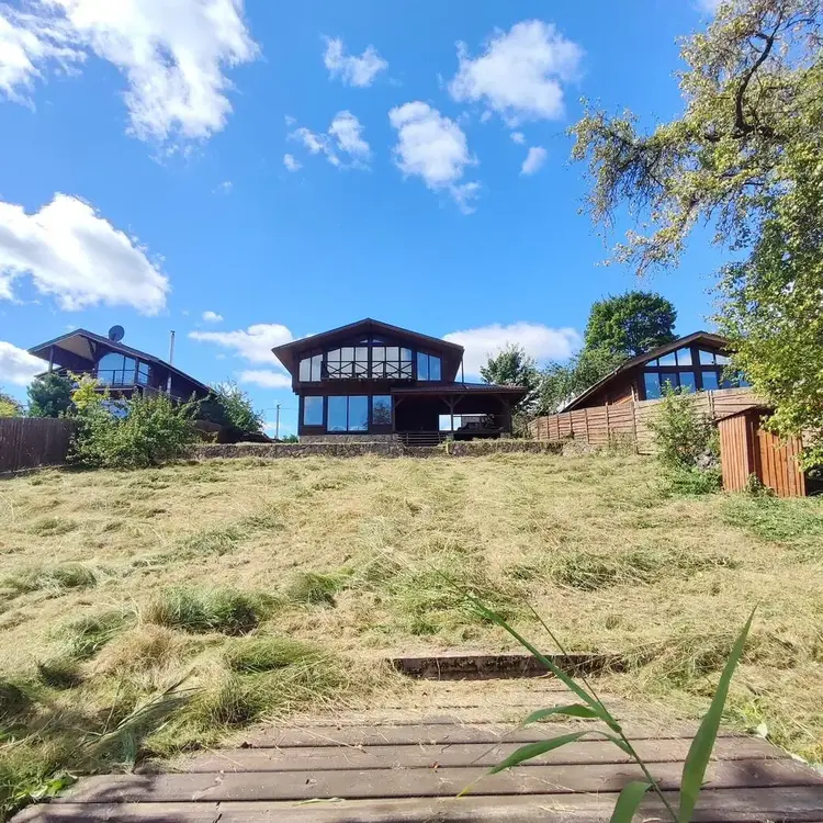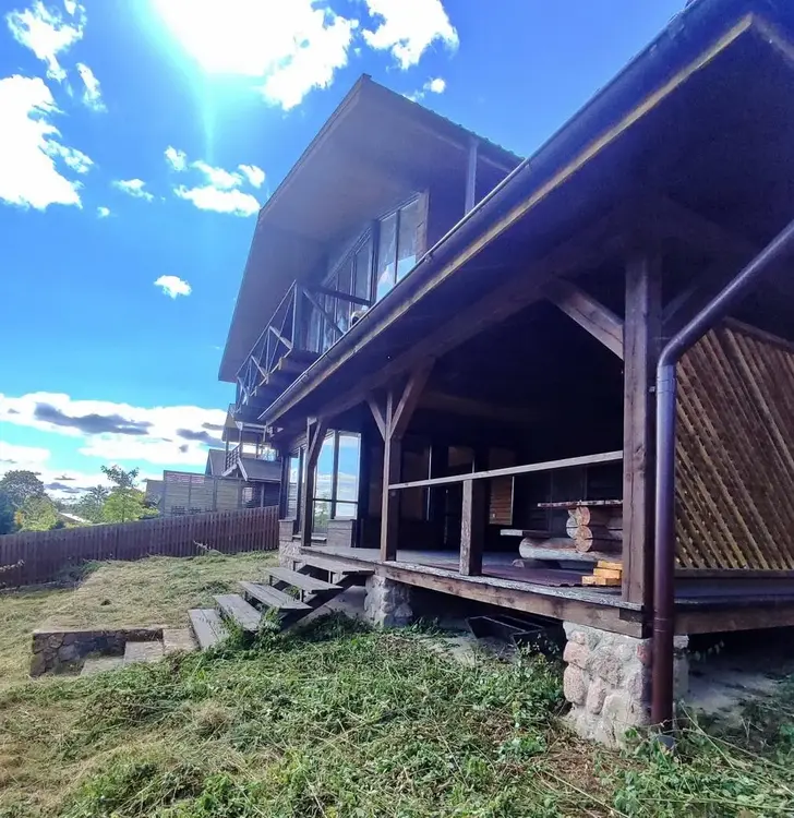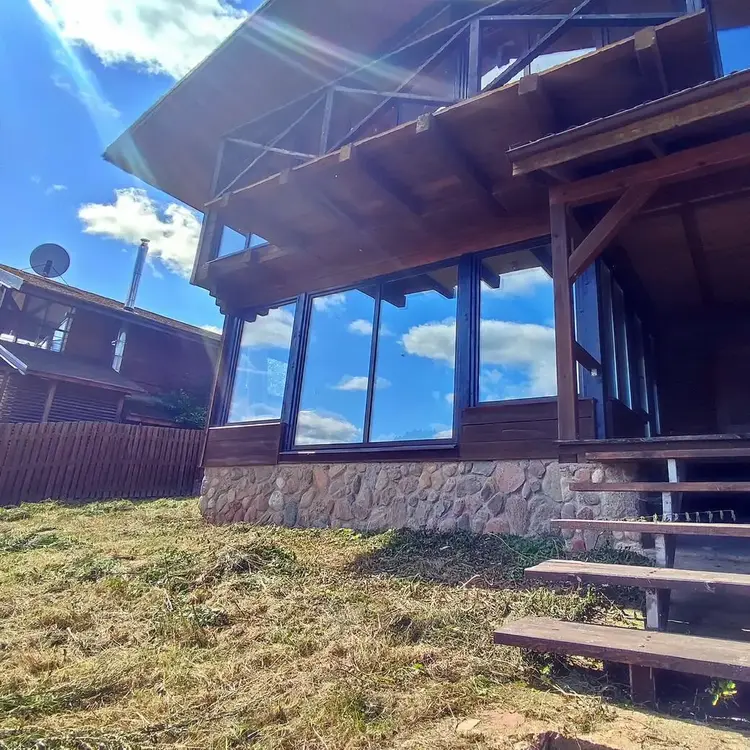 Высокое качество строительства и материалов. Уникальное сочетание дерева и стекла, дом как будто бы "воздушный"! Дом из профилированного бруса, два уровня, та часть дома, которая обращена к озеру полностью остеклена, находясь внутри дома ощущается полное единение с природой ! Внутренняя отделка - дерево и плитка - теплые полы. Необыкновенный запах дерева и воды от озера - более экологически чистого места трудно найти. Отопление - электричество и камин, канализация местная. В доме два санузла, терраса, балкон, вода -скважина.