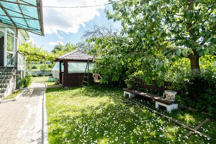 Удачно распланирована и красиво оформлена территория, прилегающая к дому. На огороженном участке 16,15 соток в частной собственности красивый, идеально ухоженный газон, высажены декоративные растения, туи, плодовые деревья (яблони, груша, черешня, вишня, слива), ягодные кустарники, клубника, виноград, есть теплица. Около дома небольшая беседка, а также место под большой бассейн, уложена плитка. Установлено уличное освещение. Забор из металлопрофиля, ворота откатные.