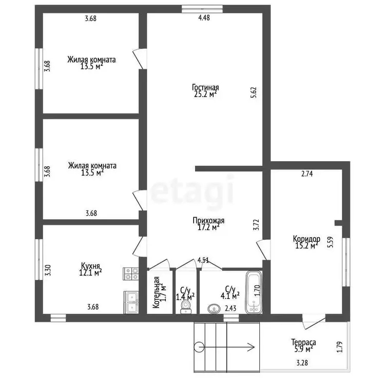 В доме 2 жилые комнаты и просторная гостиная. Кухня 12кв.м. Санузел раздельный, оборудован теплым полом.