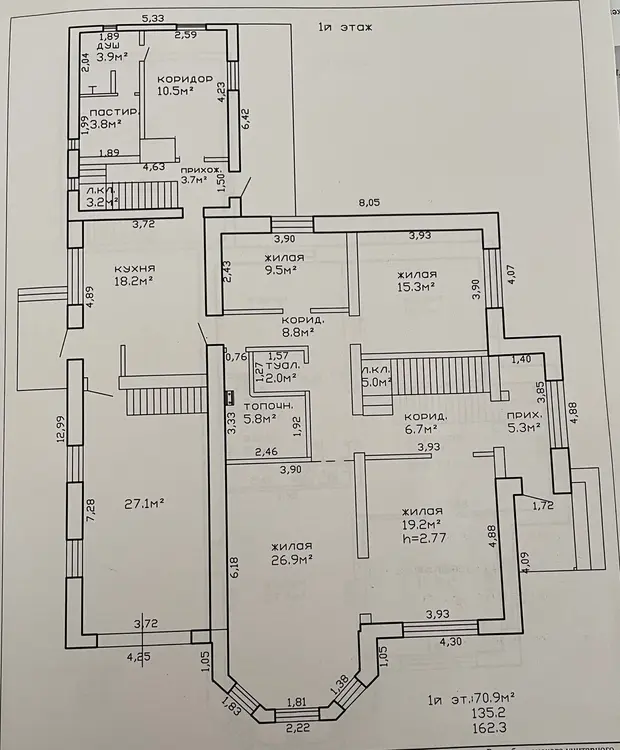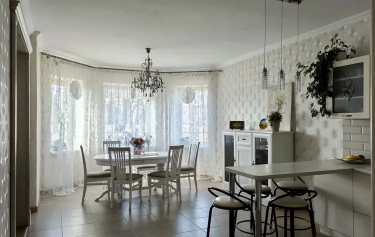 Внутри вы найдете 9 светлых и уютных комнат, а также просторную кухню- столовую площадью 26,9 м², с мебелью и бытовой техникой, хозяйственную кухню 18,2 м, банный комплекс, пристроенный к дому. Дом находится в жилом состоянии с приятным современным свежим ремонтом. Продажа с мебелью.