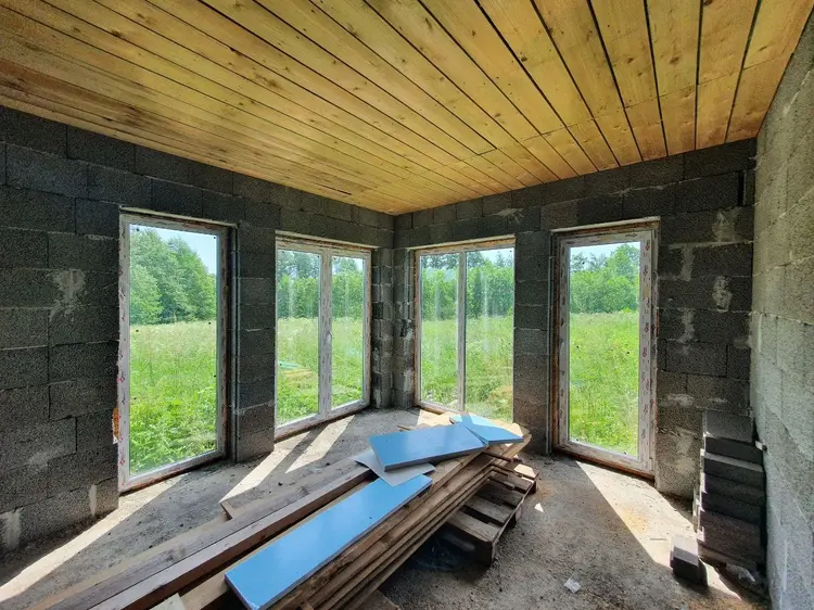 Сделана внутренняя черновая отделка полов и потолков.В наличии материал для наружной отделки и водосточной системы.