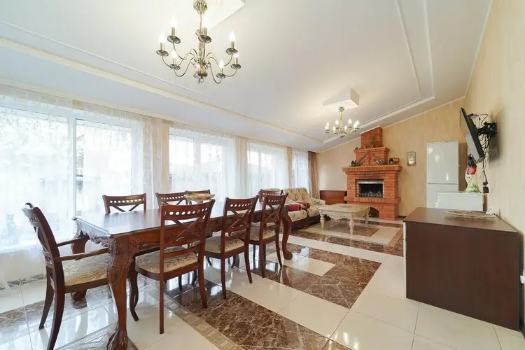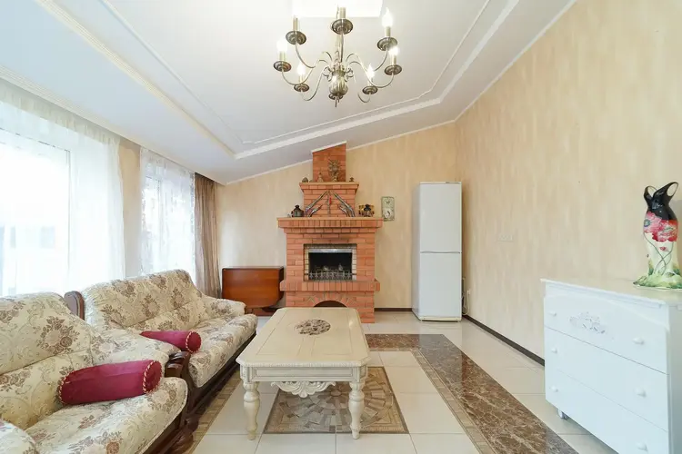 Первый этаж: располагается большая гостиная (отмечена на плане как гараж) 40 м2 с действующим камином и разделена на две обеденные группы для больших и маленьких компаний, пол - плитка. В коридоре установлен вместительный шкаф-купе на полу также плитка. Жилая комната площадью 14.7 м2. Кухня-гостиная площадью 27.9 м2 с установленной по индивидуальному дизайн проекту кухней, на полу ламинат. Раздельный сан.узел с душем.