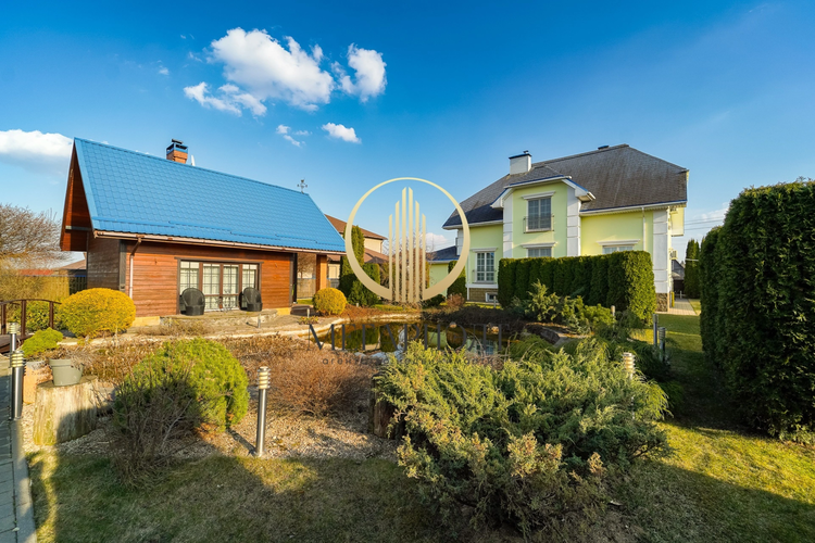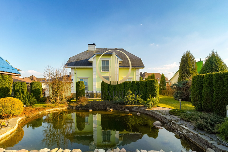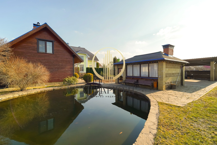 На участке выполнен ландшафтный дизайн, высажено большое количество декоративных растений и цветов и оборудован пруд. Так же на участке есть зона барбекю, навес для авто и отдельно стоящая баня.