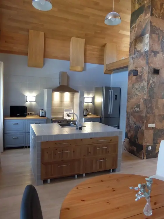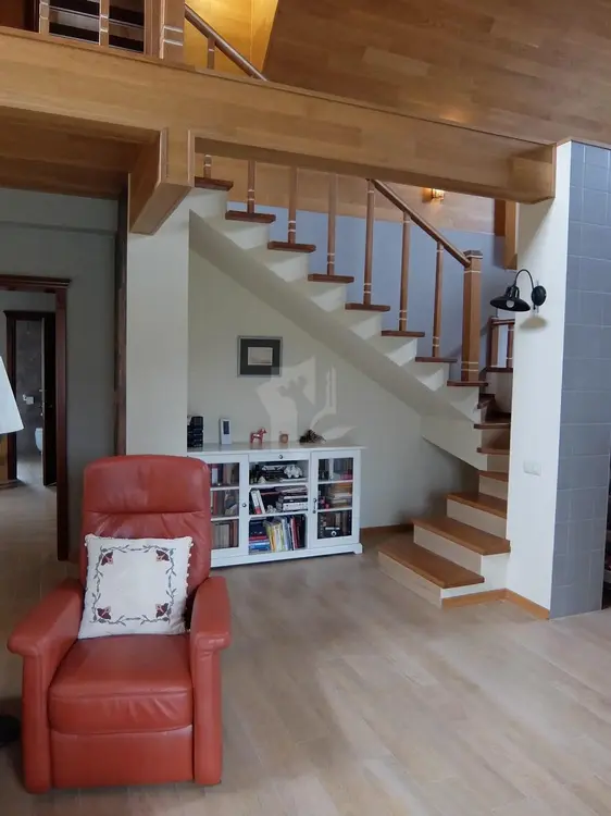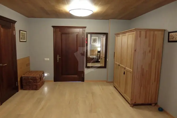 В основном доме отделка сделана панели и доски натурального дуба, материал кровли старинная прусская черепица, двери-массив лиственницы, установлены усиленные окна с энергосберегающими широкопрофильными стеклопакетами(серебряное напыление и аргон),сланцевая плитка и мрамор.