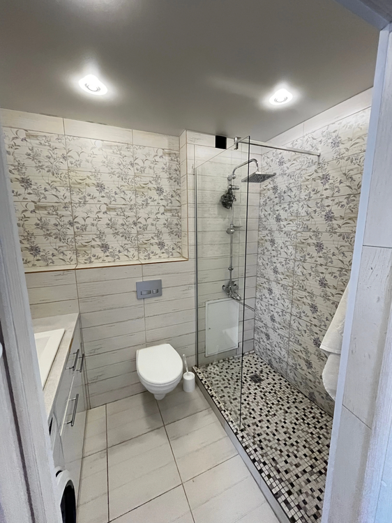 На стенах : обои, декоративный кирпич, в ванной комнате и на кухне плитка.