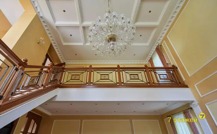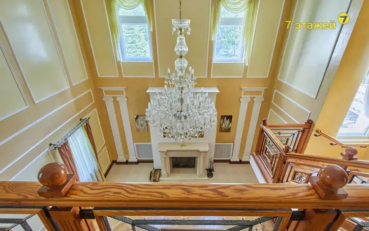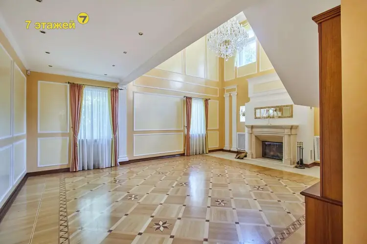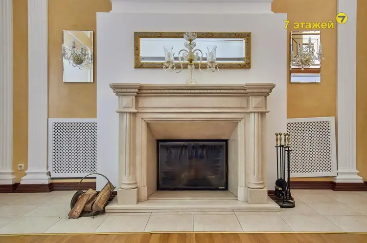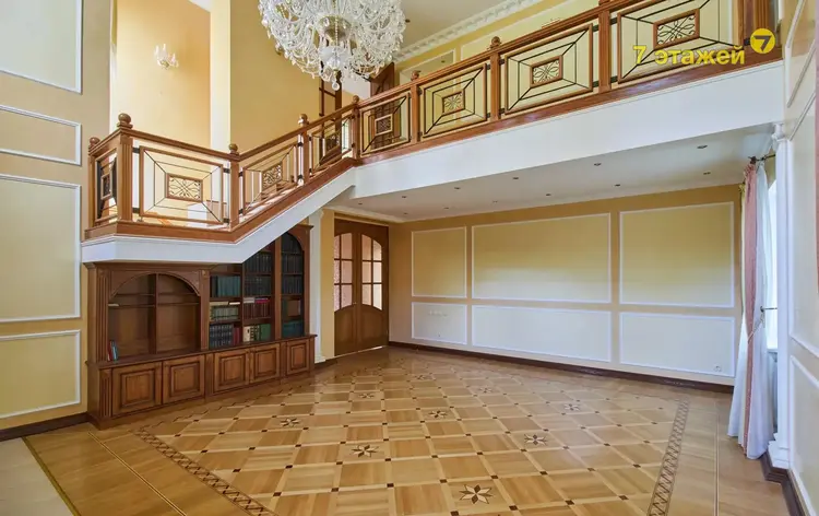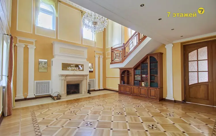На первом этаже расположены кабинет, кухня со столовой, просторная гостиная со вторым светом, которую украшает величественная люстра из богемского хрусталя, мраморный камин и библиотека. Также на первом этаже имеется просторная комната-гардероб и постирочная.